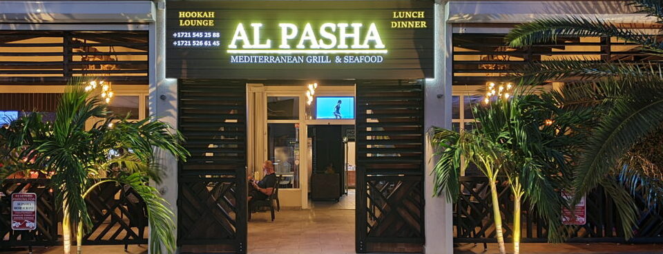 Al Pasha is located in Simpson Bay, on the left just right after passing the Simpson Bay Lagoon bridge.