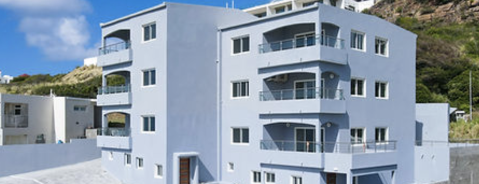 The apartment building located in Pointe Blanche, consists of three levels and features many apartments. Each apartment includes front stairs and a balcony, a kitchen, a dining/living room, a powder room, and a balcony facing the ocean side.