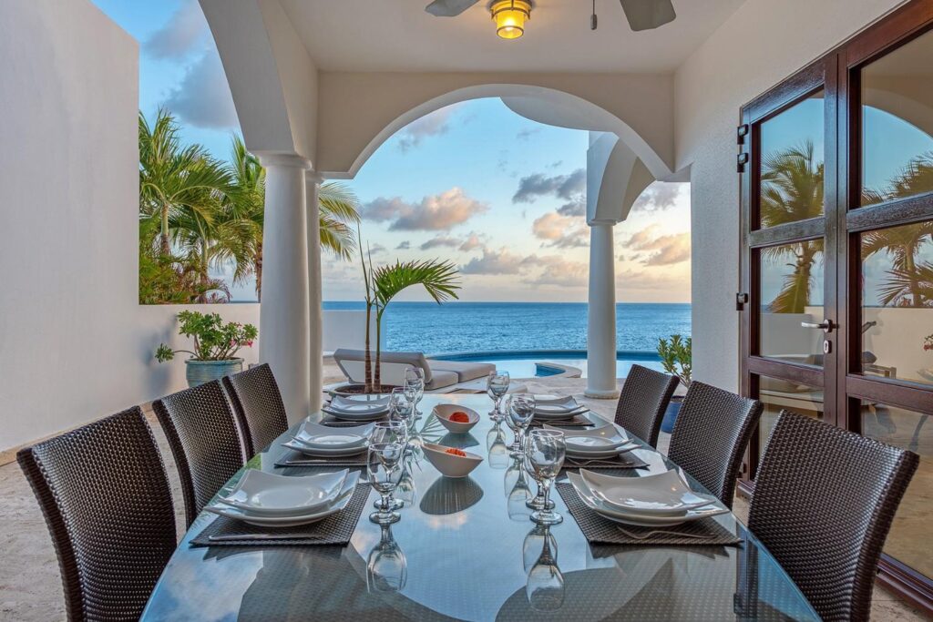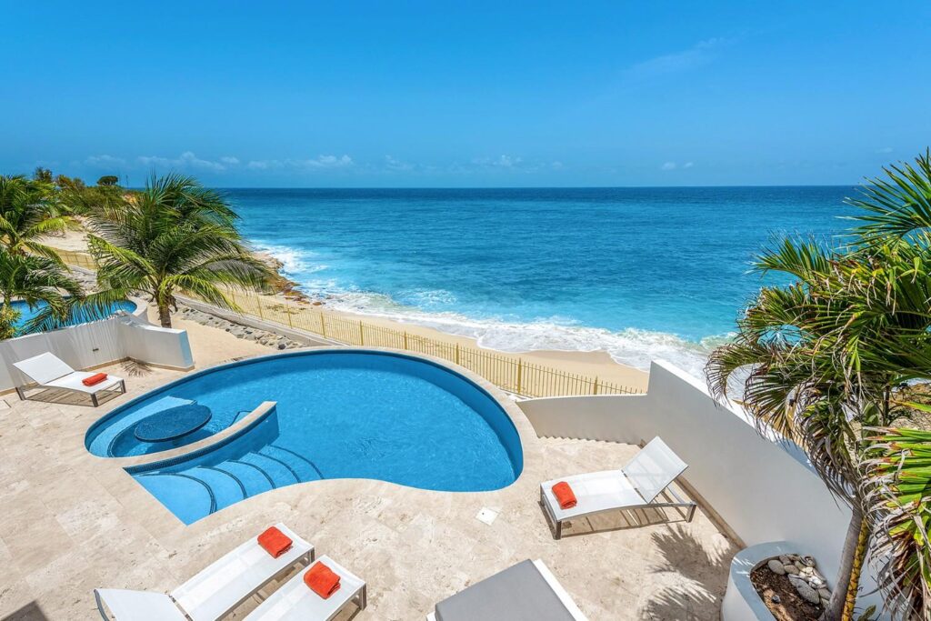 Mumbai’s exotic name reflects its exotic location, the private village of Cupecoy’s Shore Pointe right on the French/Dutch Border. Like an exquisite miniature version of a gleaming white Greek island, the villas of Shore Pointe are individual, elegant gems within a luxurious gated community. Mumbai is set apart by a beautiful miniature garden filled with palms and fragrant flowers. The entryway continues the tropical plantings, setting the stage for a beautiful contemporary decor framing the stunning view of the Caribbean Sea and the outer islands.